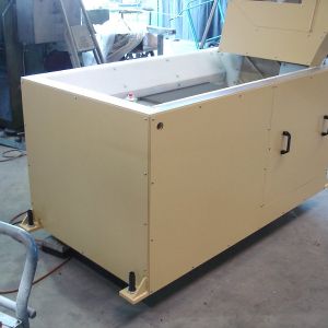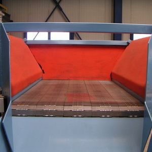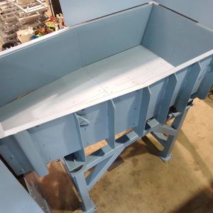 Ein breites Förderband mit aufgesetztem Bunker, welches ein kundenspezifisches Volumen aufnimmt und dosiert abgibt.